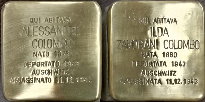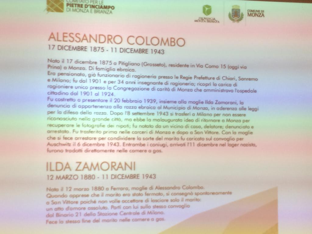 Ed arrivò con la guerra e l’invasione nazista. Alessandro mio nonno, che nel frattempo su consiglio dei figli si era rifugiato a Milano, commise un imprudenza. Tornò a Monza proprio in quella casa di fronte alla quale hanno collocato le pietre di inciampo. Tornò per prendere le foto e qualche ricordo. Inciampò invece nella codardia di alcuni monzesi che non esitarono a denunciare alle SS la presenza del “pericoloso” ebreo. Fu arrestato e portato al carcere di via Mentana e poi a san Vittore. Ilda, che non poteva immaginare una vita senza Alessandro, decise di costituirsi. Era il 7 dicembre del 1943 quando i due furono caricati su un carro bestiame. Una giornata fredda, senza sole. Dal binario 21 della stazione Centrale giunsero nel lager nazista di Auschwitz l’11 dicembre.”