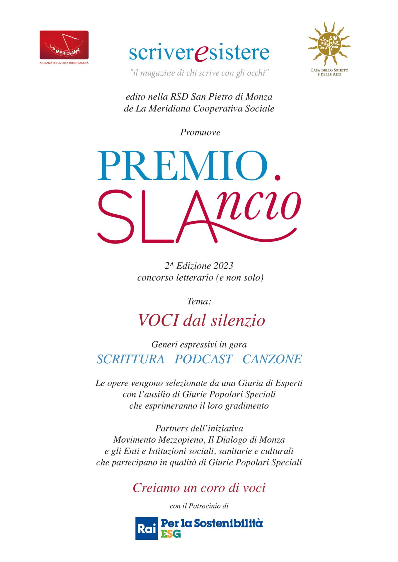 Monza, 02 febbraio 2023. Dal prossimo 20 febbraio sino al 31 marzo sarà possibile inviare le opere per partecipare alla Seconda Edizione del Premio SLAncio, concorso letterario promosso da Scriveresistere il magazine scritto con gli occhi. Il concorso è organizzato in collaborazione con la Cooperativa La Meridiana, editrice della rivista, e con la Fondazione Casa dello Spirito e delle Arti. Il Concorso Premio SLAncio vede il Patrocinio di Rai per la Sostenibilità.